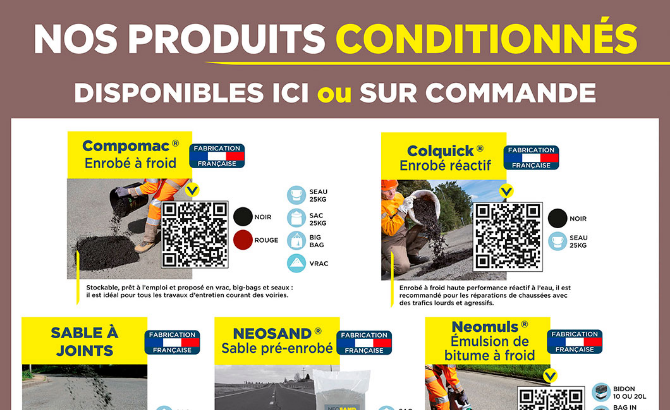 Enrobé à froid, enrobé réactif, sable à joints, sable pré-enrobé, émulsion de bitume à froid, revêtement esthétique, rénovateur d'enrobé, débituminant végétal, absorbant routier, sel de déneigement... <- Cliquez pour lire l’actualité